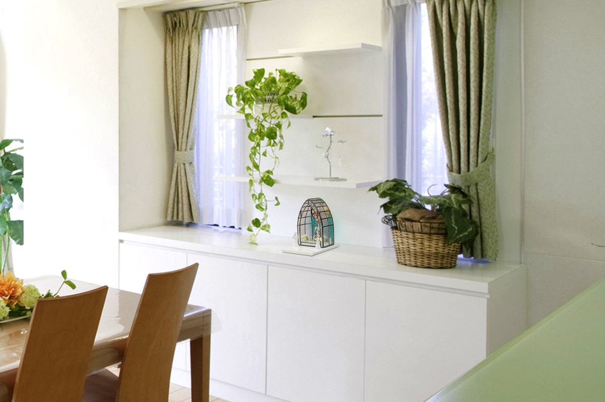 これまでの木製のお仏壇のスタイルとは違い、お洒落で華やか、でも少し落ち着きがあり、インテリアのアイテムとしても違和感がありません。