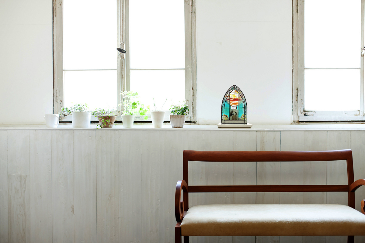 教会をイメージしたシンプルな形。明るい窓辺に置くと小さな礼拝堂から差し込む色彩が木漏れ日のように心を癒やしてくれます。