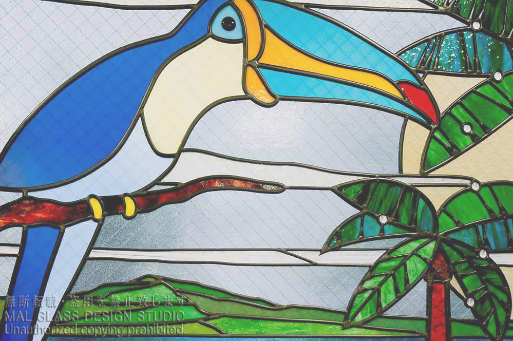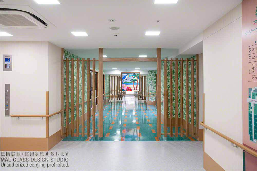 デザイン打合せの当初は、箕面と言う土地柄もあって、「紅葉と滝」をモチーフにしたデザインで進展していたのですが打合せ半ばで一転、高齢者施設と言うイメージを反転して「南国の雰囲気で明るく楽しく」と言うイメージに方向転換しました。デザインも大柄で分かりやすくガラスもハッキリとした色合いで構成しました。