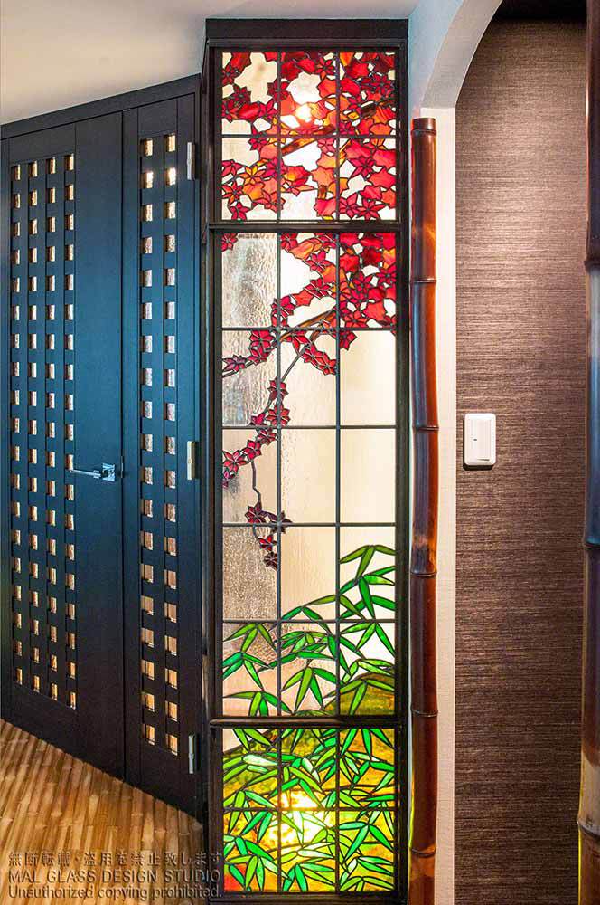 本来この施工例のモチーフとなっている桜の花や紅葉の葉などは背景のガラスがカット不可能な形状になりやすく、具象的表現ではあり得ないガラスをカットする為のライン(介線)が必要になるのですが、この作例では「和」のテイストを感じさせる格子を全面にあしらう事により、絵柄的には無意味な「介線」---見方によってはステンドグラスらしいとも言えますが---を排除する事に成功しています。