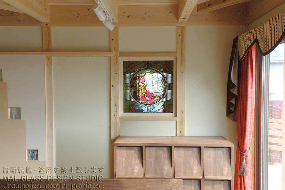 無垢の素材と漆喰が醸し出す「和」のテイストに、敢えてポップで楽しい現代的なイメージのステンドグラスをあしらってみました。