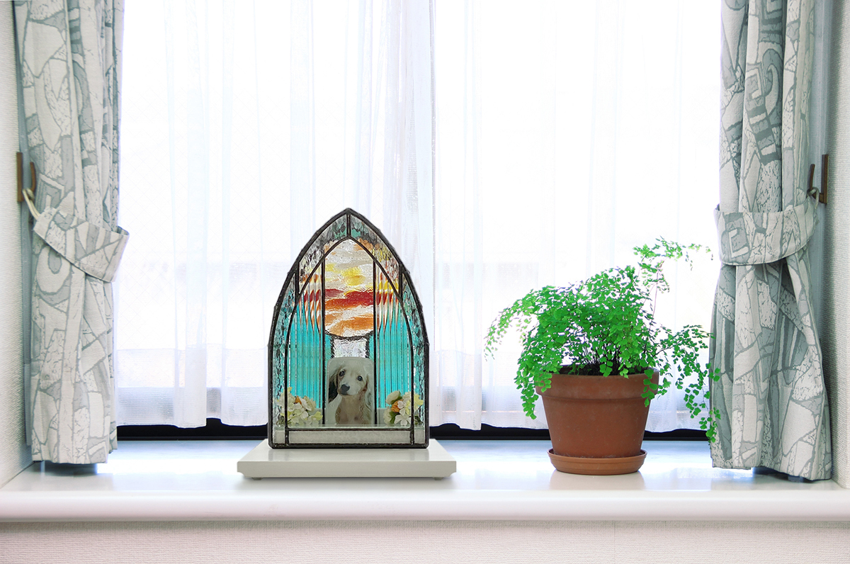 教会をイメージしたシンプルな形。明るい窓辺に置くと小さな礼拝堂から差し込む色彩が木漏れ日のように心を癒やしてくれます。
