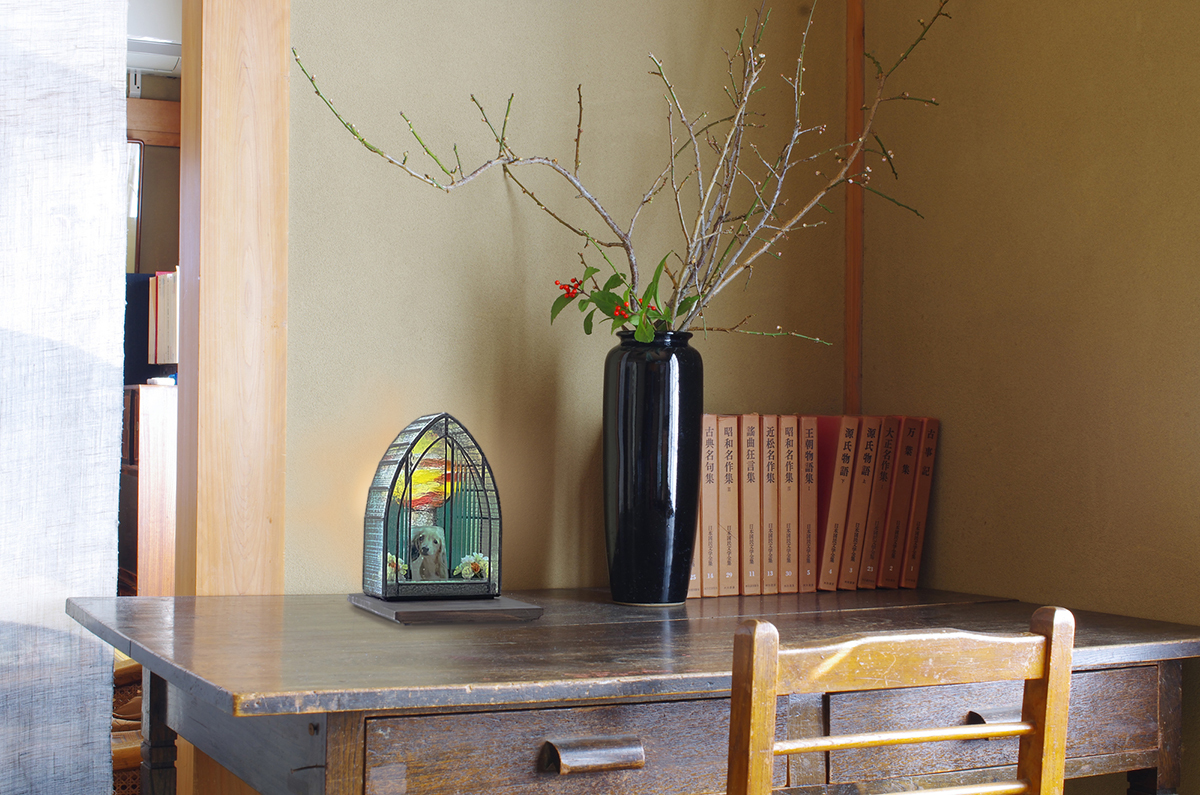 本物のステンドグラスならではの存在感がリビングルームの装飾としてもワンランク上の印象を与えます。