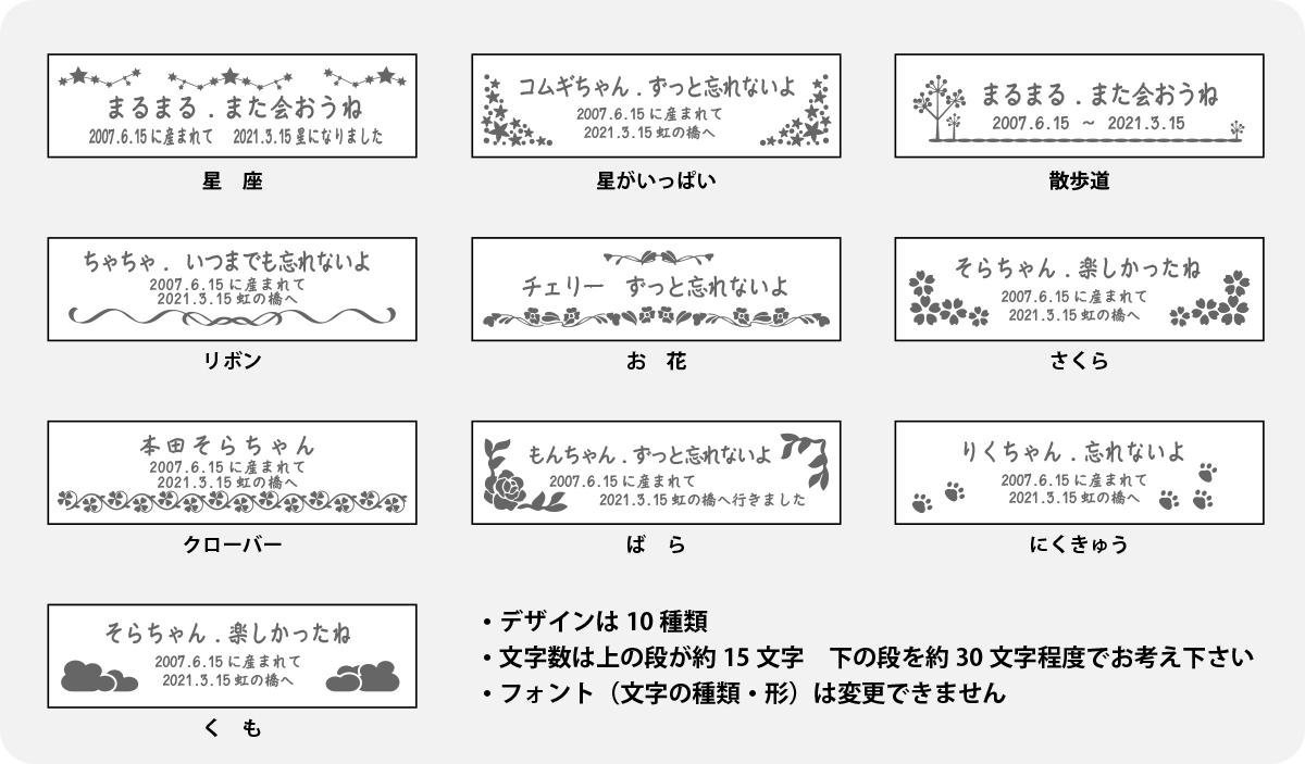 ・ペットさまのお名前や誕生日などのお日にちのほか、想い想いのメッセージを入れる事ができます。