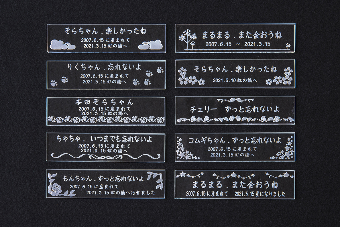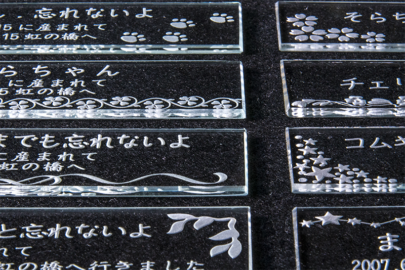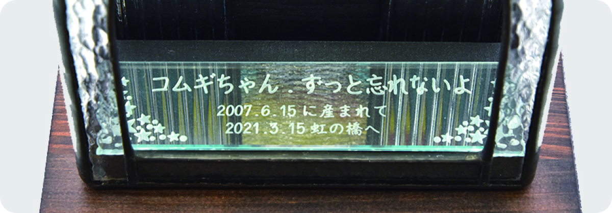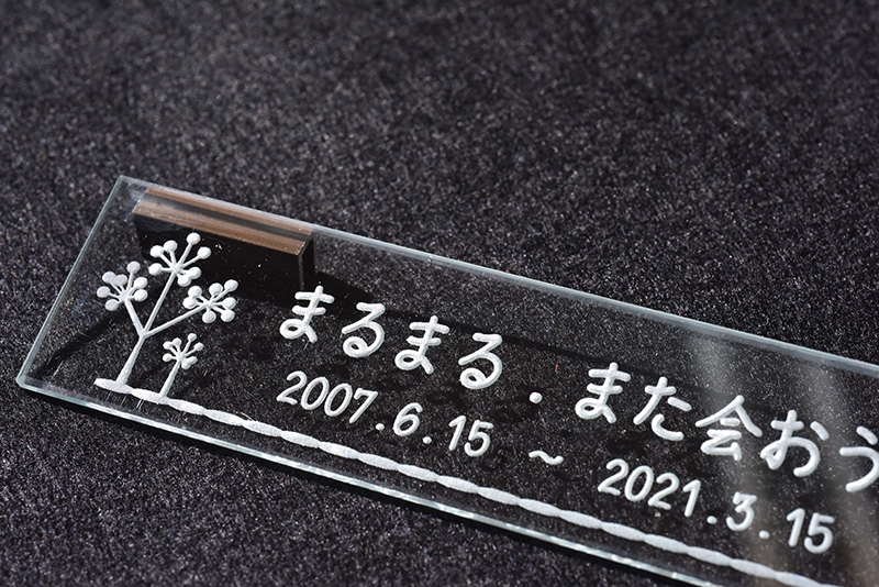 ガラスを削って彫る方法なので永遠に消える事なく虹の橋にいる家族にメッセージを送り続けます。